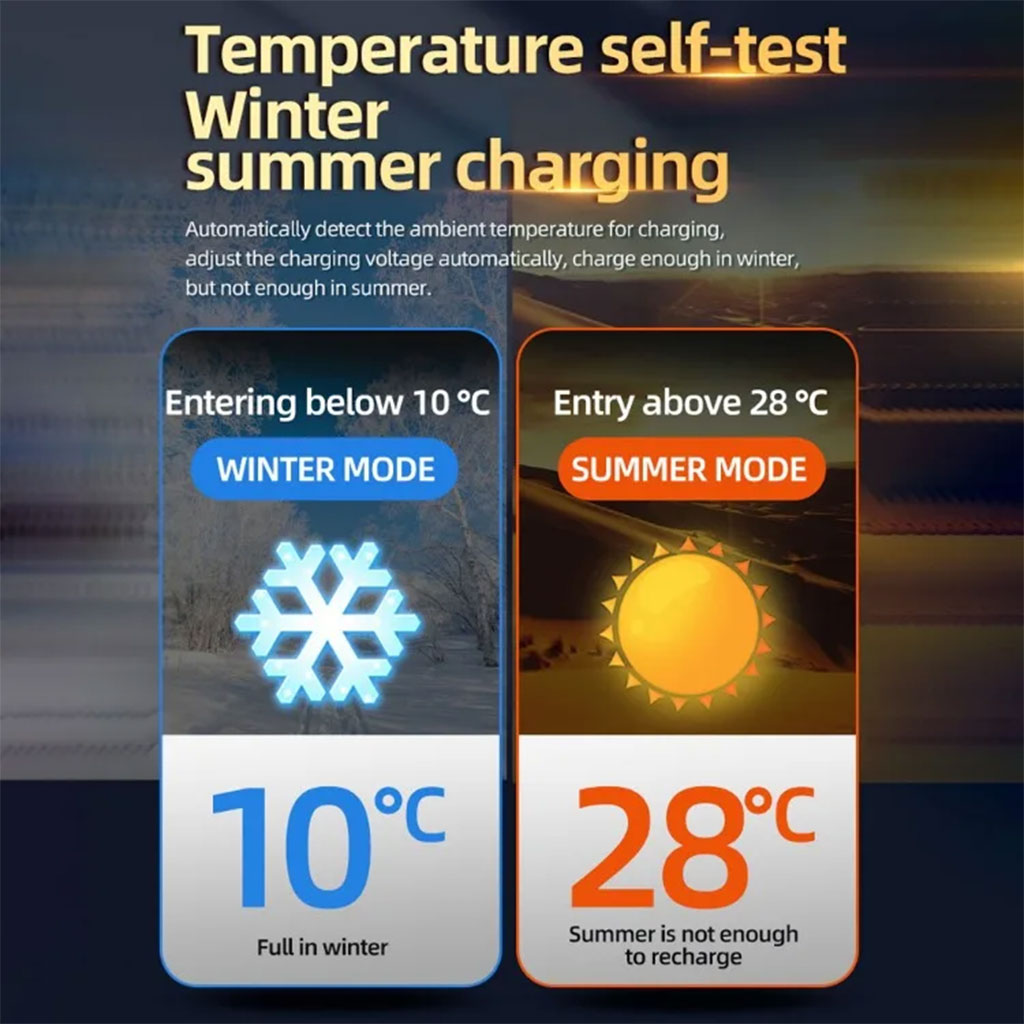 الشاحن يحدد درجة الحرارة تلقائيًا ويبدّل بين وضع الصيف والشتاء لتحسين الشحن وحماية البطارية.